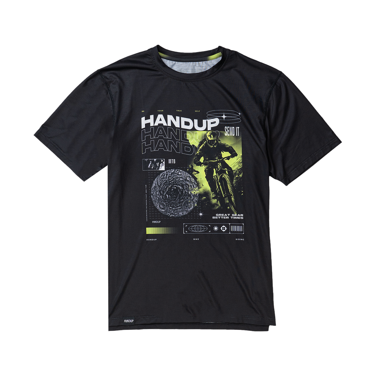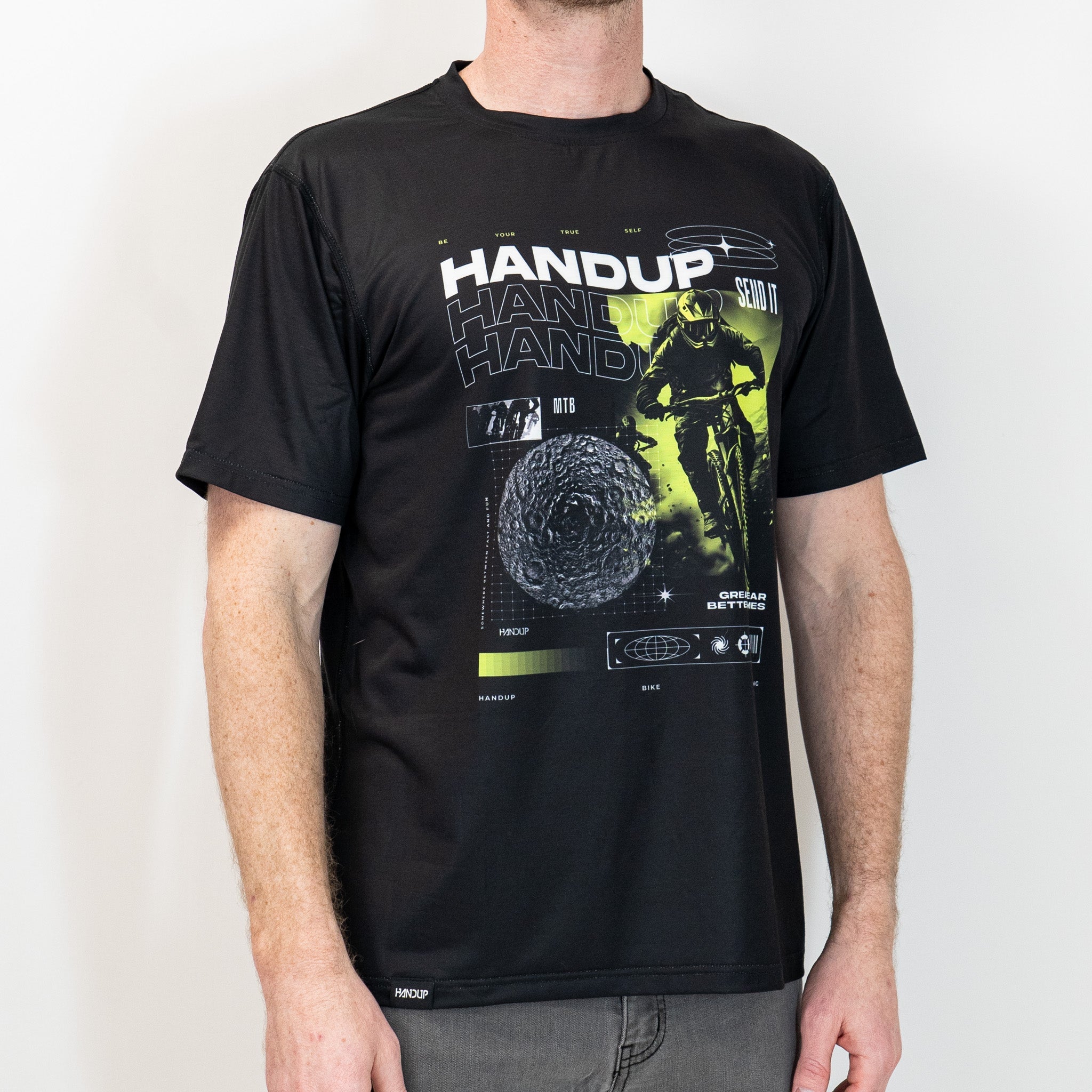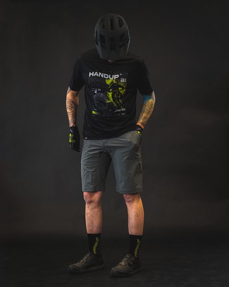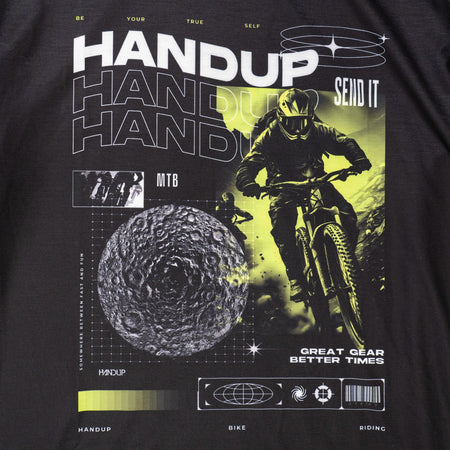 Futura means "about to be", which is what inspired us to design this post-streetwear ActiviTEE that showcases a wavy HANDUP logo and futuristic pieces that point to us "about to be" shreddin' on the bike. Welcome to the Future.